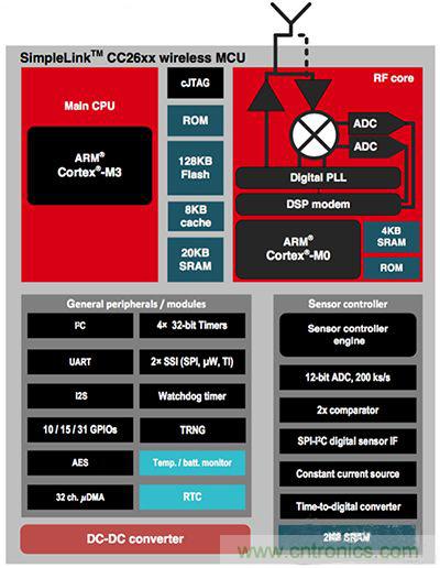 圖 4: TI 的 SimpleLink CC2650 無(wú)線 MCU 的功能框圖。