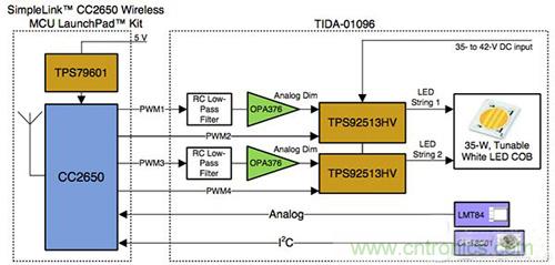 SimpleLink CC2650 無(wú)線 MCU 與 LED 驅(qū)動(dòng)器緊密協(xié)作,提供了兩個(gè)關(guān)鍵功能:驅(qū)動(dòng)器的控制信號(hào),以及以無(wú)線方式影響這些信號(hào)的功能。這樣,便可以從智能手機(jī)上運(yùn)行的應(yīng)用程序中調(diào)節(jié)光輸出或色溫,或者允許 BMS 將燈關(guān)閉、打開、調(diào)亮或調(diào)暗 — 可能使用語(yǔ)音指令。