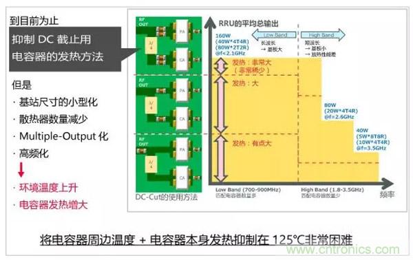 但是,近年來(lái)隨著Multiple-Output化(Tx增加)加速,一方面元件數(shù)量增加,而由于基站尺寸小型化,散熱器等散熱對(duì)策可用的空間越來(lái)越少。使用頻帶的進(jìn)一度高頻化,元件發(fā)熱進(jìn)一步增大,將電容器周邊溫度和自身發(fā)熱抑制在125℃,在電路設(shè)計(jì)上的制約案例中變得尤為顯著。