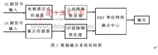 多傳感器數(shù)據(jù)融合在運用過程的各階段(例如模型建立、特征提取、目標(biāo)識別等)需要各種各樣的傳感器。由于沒有哪一類傳感器的各種性能指標(biāo)都絕對比其他類型傳感器好,因此在一個系統(tǒng)中,需要同時采用多種類型的傳感器,以提高系統(tǒng)檢測、識別、分類和決策能力。本文根據(jù)系統(tǒng)的需要使用了兩類傳感器:電磁感應(yīng)式傳感器和霍爾傳感器,利用它們之間產(chǎn)生的冗余信息進(jìn)而檢測出缺陷信號。數(shù)據(jù)融合系統(tǒng)結(jié)構(gòu)如圖1所示。