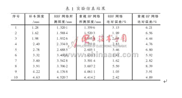 本文采用MATLAB軟件進(jìn)行仿真實驗,通過提供的40組人工裂縫的樣本,對RBF神經(jīng)網(wǎng)絡(luò)系統(tǒng)進(jìn)行訓(xùn)練學(xué)習(xí)和模式識別,并在學(xué)習(xí)初期對輸入數(shù)據(jù)進(jìn)行了預(yù)處理,通過樣本訓(xùn)練逐漸生成最佳的RBF期網(wǎng)絡(luò)[8]。另取10組測試樣本數(shù)據(jù)作為輸入,用MATLAB軟件進(jìn)行模擬仿真,同時利用RBF神經(jīng)網(wǎng)絡(luò)對其進(jìn)行深度評估,并與常規(guī)BP神經(jīng)網(wǎng)絡(luò)進(jìn)行對比,其實驗仿真結(jié)果如表1所示。