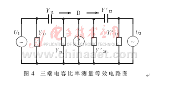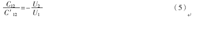 如果將兩個(gè)三端電容串接起來,分別用兩個(gè)信號源供電,就形成了如圖4所示的等效電路,其中,Y12=jωC12,Y′12=jωC′12。在公共點(diǎn)D與接地端之間連接一個(gè)檢流計(jì),調(diào)節(jié)兩個(gè)外加電壓的幅值和相位,使通過兩個(gè)直接電容流向D點(diǎn)的電流大小相等、方向相反,直道檢流計(jì)指零,便可得到下面的關(guān)系式: