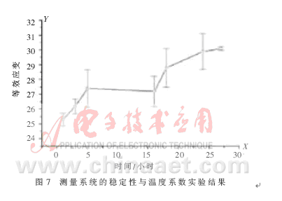 擬合方程顯示在圖中上部的方框里。從實(shí)驗(yàn)結(jié)果可看出,一微米位移可獲得變壓器電橋讀數(shù),變化為127.02,輸出特性的非線性誤差小于0.15%F.S.。比率臂第五檔變化一個(gè)數(shù)對應(yīng)的位移量根據(jù)傳感器結(jié)構(gòu)的不同,一般在5~8納米之間,末級的數(shù)據(jù)采集器可獲得300多毫伏的輸出,從數(shù)據(jù)采集器便能夠分辨出0.02納米的變化。在實(shí)驗(yàn)室環(huán)境下,傳感器測值隨著溫度的變化會產(chǎn)生極大的漂移,用標(biāo)準(zhǔn)元件來檢查變壓器電橋測量系統(tǒng)的溫度系數(shù)與穩(wěn)定性,所得結(jié)果見圖7。在28小時(shí)的實(shí)驗(yàn)期間測值等效變化僅為0.1納米,環(huán)境溫度變化為3~4℃。作者還曾將差動電容式位移傳感器放到100米深的鉆井底部,那里溫度的年變化不到0.03℃,整個(gè)位移測量系統(tǒng)月漂 移率僅為0.1納米[3]。