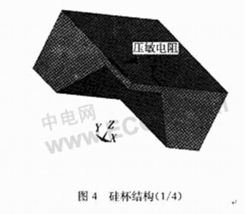 其中,壓阻式壓力傳感器主要是利用半導(dǎo)體的壓阻效應(yīng),把一個惠斯通電橋做在一個硅杯上,如圖4所示。當硅杯受到壓力后發(fā)生形變,惠斯通電橋的四個橋臂電阻就會發(fā)生變化,打破了電橋的電平衡,從而會有一個電信號的輸出。