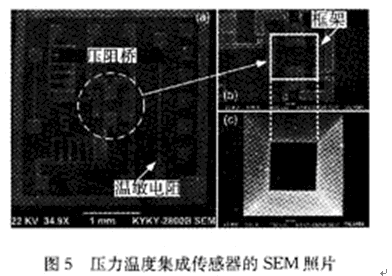 圖5是本文制作的傳感器芯片的電鏡照片。圖5(a)為器件正面全貌;圖5(b)為薄膜正面;圖5(c)為薄膜背面。其中壓敏元件采用比常規(guī)更厚的50μm硅杯薄膜(500 μm×500μm),增大了體硅上高應(yīng)力區(qū)的面積,在降低工藝要求的同時提高了線性測量范圍和過載壓力。壓敏電阻設(shè)計為折線結(jié)構(gòu),采用優(yōu)化的幾何尺寸,并將其部分制作在高應(yīng)力體硅上以獲得更高靈敏度。體硅上的溫敏電阻隨壓敏電阻利用同步注入工藝制作,減小了工藝復(fù)雜度。該器件工藝簡單,成品率高,與標準IC工藝兼容。