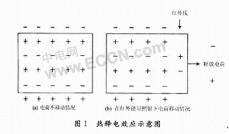 某些強介電物質(zhì)(PZT,LiTaO3等)的表面接受了紅外線的輻射能量,其表面產(chǎn)生溫度變化,隨著溫度的上升或下降,這些物質(zhì)表面上就會產(chǎn)生電荷的變化,這種現(xiàn)象稱為熱釋電效應(yīng)。圖1為晶體表面電荷隨溫度變化的移動情況[1]。