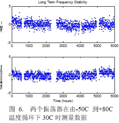 圖6顯示了在進(jìn)行溫度循環(huán)試驗(yàn)時(shí)兩個(gè)振蕩器的頻率穩(wěn)定度。數(shù)據(jù)在-50℃到+80℃正溫度循環(huán)和負(fù)溫度循環(huán)中的30℃情況下獲得,數(shù)據(jù)采集自600個(gè)溫度循環(huán),以3ppm為規(guī)范容許范圍則沒有頻率漂移。