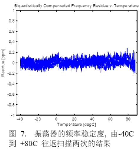 圖7為補(bǔ)償后的頻率穩(wěn)定性數(shù)據(jù), 溫度從-40℃到+85℃范圍內(nèi)掃描兩次并返回到-40℃。整個(gè)溫度范圍的總頻率誤差小于100ppm (200ppm測量噪底,30ppm測量誤差),遲滯大約小于50ppm。