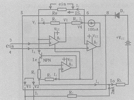 Rs為增益調(diào)節(jié)電阻,調(diào)節(jié)Rs可使輸入電壓ein在從最小值變到最大值時(shí)使輸出電流Io從4mA變到20mA。即△I=16mA的輸出電流。需要注意的是:為使Io不超過(guò)20mA,當(dāng)Rs=∞時(shí),ein不應(yīng)超過(guò)1V,而當(dāng)Rs減小時(shí),ein也應(yīng)相應(yīng)減小。