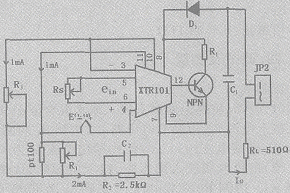 熱電偶作為感溫元件,采集溫度信號(hào);鉑電阻作為補(bǔ)償電阻,補(bǔ)償熱電偶的冷端溫度;XTR101為小信號(hào)處理專(zhuān)用芯片,將輸入的微弱信號(hào)放大后便于遠(yuǎn)端傳輸;RL為遠(yuǎn)端的負(fù)載電阻,便于電信號(hào)的測(cè)量。