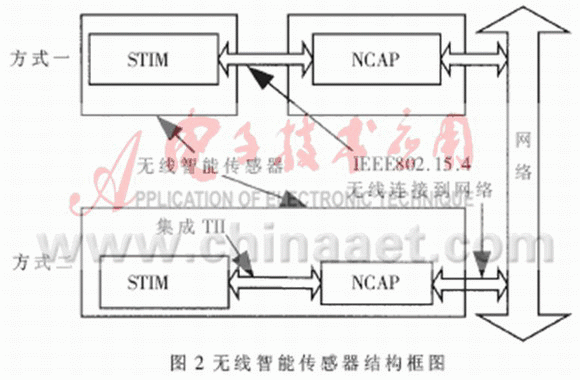 方案之一是無線STIM(智能傳感器接口模型):STIM與NCAP之間不再是TII接口(傳感器獨立接口),而是通過IEEE802.15.4無線(收發(fā)模塊)傳輸信息。傳感器或執(zhí)行器的信息由STIM通過無線網絡傳遞到NCAP終端,進而與有線網絡相連。另外,還可以在NCAP與網絡間的接口替換為無線接口。