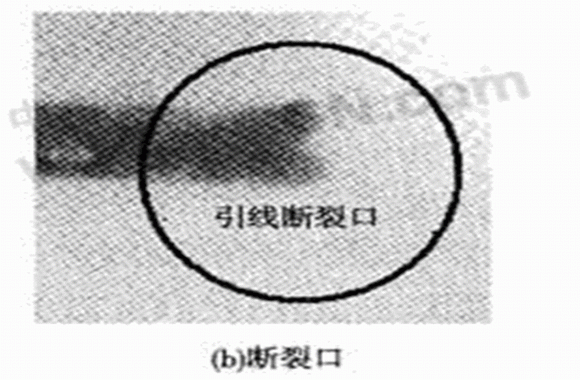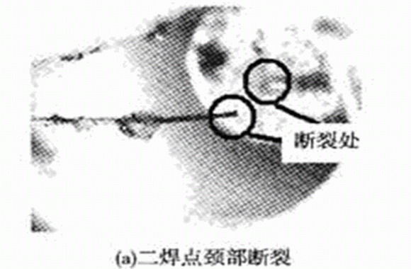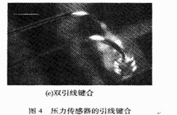 用于引線鍵合的鍵合線有Al線和Au線,由于Au線性能更優(yōu),所以壓力傳感器的鍵合工藝選用Au線。鍵合時要使鍵合面保持清沽,否則會影響鍵合強度,等離子清洗是一種能有效提高鍵合強度的方法。由于機油壓力傳感器工作環(huán)境惡劣,尤其是頻繁的振動會導致金絲有缺陷的地方疲勞斷裂,或者最容易疲勞的位置如第二焊點附近的頸部位置發(fā)生斷裂,因此要求更高的鍵合質量。曾對所研制的機油壓力傳感器進行了臺架試驗,在一批試驗樣品中經(jīng)過6×105次加壓和卸壓試驗之后,發(fā)現(xiàn)有兩個樣品失效,故障分析結果表明:一個樣品的失效模式為信號處理電路上的一個電阻損壞;另一個樣品的失效模式為金絲線斷裂,如圖4(a),(b)所示。對于這種情況,可以采用雙金絲鍵合工藝,并盡量選用高純度、低缺陷的金絲,并做好引線鍵合前各封裝器件的清潔工作,如圖4(c)所示。這樣對金絲鍵合工藝進行改進后,在可靠性試驗中,未曾出現(xiàn)金絲斷裂的質量問題。