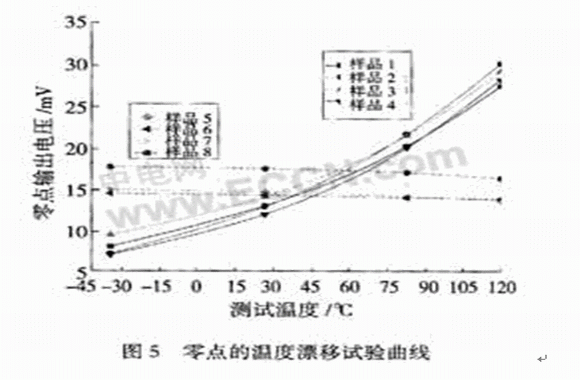由于芯片對所處環(huán)境的要求比較特殊,所以與硅芯片接觸的硅油需要具備以下特點:良好的介電性能、盡可能小的熱脹系數(shù)、化學穩(wěn)定性好以及耐熱和耐寒性能好。硅油的凈化處理是薄膜隔離式壓力傳感器封裝中至關重要的工藝步驟,因為若凈化不干凈,硅油或傳感器受壓部分的充油腔內(nèi)就會混有氣體、水分等可壓縮、易揮發(fā)的物質,在全溫區(qū)內(nèi)的體積變化就會沒有規(guī)律可言,造成外界的待測壓力不能準確、規(guī)則地傳遞到芯片,從而使得壓力傳感器的溫漂比較嚴重。這種現(xiàn)象反映在零點的溫漂上,可以用來評價封裝的好壞。通常,由于在恒壓源激勵的情況下壓力傳感器的靈敏度溫度系數(shù)為負值,所以壓力傳感器的零點稍有下降,如圖5的樣品5,6,7,8所示;而硅油凈化不充分的壓力傳感器零點的溫漂卻非常大,且隨著溫度的升高而升高,如圖5中的樣品1,2,3,4所示。試驗表明,像樣品1,2,3,4這類溫漂很大的傳感器的溫度補償是比較困難的,所以封裝時必須確保硅油品質和填充量恰到好處。