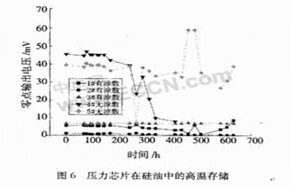 1#,2#,3#涂敷了保護層,4#,5#沒有涂敷保護層??梢钥吹?,沒有保護層的傳感器在高溫下存儲了約200 h后,它的零點突然發(fā)生了變化,之后數(shù)據(jù)不穩(wěn)定;涂了保護層的壓力傳感器的零點在600多小時后仍然很穩(wěn)定。因此,為了防止硅油的污染導致壓力傳感器的失效,我們采取了一些必要的措施。首先,選擇高溫下盡可能穩(wěn)定的硅油;其次,盡量選擇具有良好鈍化層的芯片;最后,在不影響靈敏度的前提下,還可以在封裝過程中對芯片以及引線進行涂敷鈍化層的處理。
