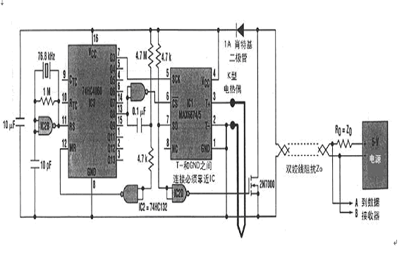 由于EMI與線長度成正比,所以使噪聲最小的通常選擇是把控制電路靠近感測點(diǎn),增加1個(gè)靠近感測點(diǎn)的遠(yuǎn)程板或采用復(fù)雜的信號濾波和纜線屏蔽。1個(gè)比較妙的方案是在靠近感測點(diǎn)數(shù)字化熱電偶輸出(圖1).