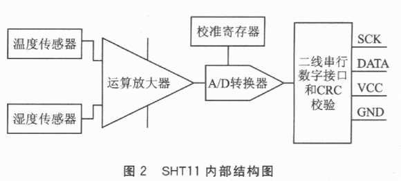 溫濕度傳感器SHTl1將溫度感測(cè)、濕度感測(cè)、信號(hào)變換、A/D轉(zhuǎn)換和加熱器等功能集成到一個(gè)芯片上,其內(nèi)部結(jié)構(gòu)如圖2所示。該芯片包括一個(gè)電容性聚合體濕度敏感元件和一個(gè)用能隙材料制成的溫度敏感元件。這兩個(gè)敏感元件分別將濕度和溫度轉(zhuǎn)換成電信號(hào),該電信號(hào)首先進(jìn)入微弱信號(hào)放大器進(jìn)行放大;然后進(jìn)入一個(gè)14位的A/D轉(zhuǎn)換器;最后經(jīng)過(guò)二線串行數(shù)字接口輸出數(shù)字信號(hào)。SHT11在出廠前,都會(huì)在恒濕或恒溫環(huán)境中進(jìn)行校準(zhǔn),校準(zhǔn)系數(shù)存儲(chǔ)在校準(zhǔn)寄存器中;在測(cè)量過(guò)程中,校準(zhǔn)系數(shù)會(huì)自動(dòng)校準(zhǔn)來(lái)自傳感器的信號(hào),此外,SHT11內(nèi)部還集成了一個(gè)加熱元件,加熱元件接通后可以將SHTll的溫度升高5℃左右,同時(shí)功耗也會(huì)有所增加。此功能主要為了比較加熱前后的溫度和濕度值,可以綜合驗(yàn)證兩個(gè)傳感器元件的性能。在高濕(>95%RH)環(huán)境中,加熱傳感器可預(yù)防傳感器結(jié)露,同時(shí)縮短響應(yīng)時(shí)間,提高精度。加熱后SHTll溫度升高、相對(duì)濕度降低,較加熱前,測(cè)量值會(huì)略有差異。