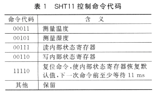 微處理器是通過(guò)二線串行數(shù)字接口與SHTl1進(jìn)行通信的。通信協(xié)議與通用的I2C總線協(xié)議是不兼容的,因此需要用通用微處理器I/O口模擬該通信時(shí)序。微處理器對(duì)SHTll的控制是通過(guò)5個(gè)5位命令代碼來(lái)實(shí)現(xiàn)的,命令代碼的含義如表1所列。