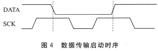 微處理器和溫濕度傳感器通信采用串行二線接口SCK和DATA,其中SCK為時(shí)鐘線,DATA為數(shù)據(jù)線。該二線串行通信協(xié)議和I2C協(xié)議是不兼容的。在程序開(kāi)始,微處理器需要用一組“啟動(dòng)傳輸”時(shí)序表示數(shù)據(jù)傳輸?shù)膯?dòng),如圖4所示。當(dāng)SCK時(shí)鐘為高電平時(shí),DATA翻轉(zhuǎn)為低電平;緊接著SCK變?yōu)榈碗娖剑S后又變?yōu)楦唠娖?在SCK時(shí)鐘為高電平時(shí),DATA再次翻轉(zhuǎn)為高電平。