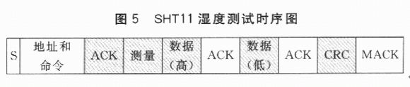 SHTll濕度測(cè)試時(shí)序如圖5所示。其中,陰影部分為SHTll控制總線。主機(jī)發(fā)出啟動(dòng)命令,隨后發(fā)出一個(gè)后續(xù)8位命令碼。該命令碼包含3個(gè)地址位(芯片設(shè)定地址為000)和5個(gè)命令位;發(fā)送完該命令碼,將DATA總線設(shè)為輸入狀態(tài)等待SHTll的響應(yīng);SHTll接收到上述地址和命令碼后,在第8個(gè)時(shí)鐘下降沿,將DATA下拉為低電平作為從機(jī)的ACK;在第9個(gè)時(shí)鐘下降沿之后,從機(jī)釋放DATA(恢復(fù)高電平)總線;釋放總線后,從機(jī)開(kāi)始測(cè)量當(dāng)前濕度,測(cè)量結(jié)束后,再次將DATA總線拉為低電平;主機(jī)檢測(cè)到DATA總線被拉低后,得知濕度測(cè)量已經(jīng)結(jié)束,給出SCK時(shí)鐘信號(hào);從機(jī)在第8個(gè)時(shí)鐘下降沿,先輸出高字節(jié)數(shù)據(jù);在第9個(gè)時(shí)鐘下降沿,主機(jī)將DATA總線拉低作為ACK信號(hào),然后釋放總線DATA;在隨后8個(gè)SCK周期下降沿,從機(jī)發(fā)出低字節(jié)數(shù)據(jù);接下來(lái)的SCK下降沿,主機(jī)再次將DATA總線拉低作為接收數(shù)據(jù)的ACK信號(hào);最后8個(gè)SCK下降沿從機(jī)發(fā)出CRC校驗(yàn)數(shù)據(jù),主機(jī)不予應(yīng)答(NACK)則表示測(cè)量結(jié)束。