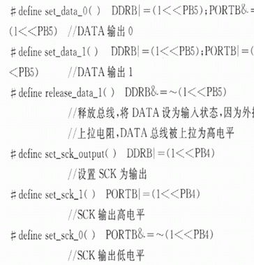 通過(guò)以上宏定義,可以實(shí)現(xiàn)SCK和DATA總線的各種輸入和輸出狀態(tài)。為了模擬該二線串行數(shù)字協(xié)議,還需要一個(gè)延時(shí)函數(shù)。WINAVR庫(kù)函數(shù)提供了一個(gè)延時(shí)函數(shù)_delay_loop_2(unslgned char s),該延時(shí)函數(shù)運(yùn)行用4個(gè)時(shí)鐘周期,所以白定義延時(shí)1μs函數(shù)可以定義如下:#deftne CPU_CRYSTAL 7.3728