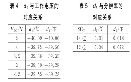 式中:d1和d2為特定系數(shù),d1的取值與SHTll工作電壓有關(guān),d2的取值則與SHTll內(nèi)部A/D轉(zhuǎn)換器采用的分辨率有關(guān),其對(duì)應(yīng)關(guān)系分別如表4和表5所列。