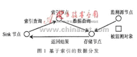 (4)基于索引的數(shù)據分發(fā)方案(index-based data dissemination scheme)[3],這種方案克服了以上幾種方案存在的問題。在這種方案中,負責監(jiān)測某對象的源節(jié)點定期產生該監(jiān)測對象的感知數(shù)據,并存儲到存儲節(jié)點上,存儲節(jié)點可能是該源節(jié)點,也可能是鄰近的某個節(jié)點。同時,存儲節(jié)點的位置信息(稱為索引),要增加到索引節(jié)點上。當sink節(jié)點想查詢某個被監(jiān)測對象產生的感知數(shù)據時,就發(fā)送一條查詢消息給有關的索引節(jié)點,索引節(jié)點收到該消息后轉發(fā)查詢請求給相應的存儲節(jié)點,由存儲節(jié)點直接發(fā)送查詢結果給sink節(jié)點。其基本思想如圖1所示。這種數(shù)據分發(fā)方案避免了發(fā)送不需要的感知數(shù)據,也不需要把控制信息泛洪到整個網絡,改善了整個系統(tǒng)的性能,但是增加了維護索引節(jié)點的額外費用。