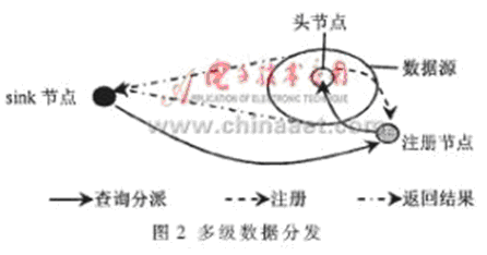 (5)多級數(shù)據分發(fā)方案(multi-resolution data dissemination scheme)[4],綜合了LS和DCS數(shù)據分發(fā)方案的技術。其基本思想是在數(shù)據源中選擇一個頭節(jié)點,代表源節(jié)點在最近的注冊節(jié)點上進行注冊。sink節(jié)點把查詢發(fā)送到所有注冊節(jié)點上,從注冊節(jié)點再把查詢發(fā)送到所有匹配的頭節(jié)點,當頭節(jié)點收到查詢后,在數(shù)據源內選擇一組節(jié)點進行查詢。由于sink節(jié)點的位置包含在它分派的查詢中,查詢節(jié)點可以直接把感知數(shù)據發(fā)送給sink節(jié)點,其基本思想如圖2所示。這種數(shù)據分發(fā)方案避免了查詢泛洪,能有效減少能量消耗。但是在數(shù)據源中只是基于感知范圍參數(shù)來選擇查詢節(jié)點,沒有考慮數(shù)據的分布情況。