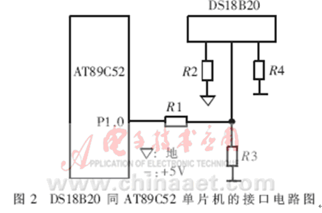 DS18B20的測溫原理為:內(nèi)部計數(shù)器對一個受溫度影響的振蕩器的脈沖計數(shù),低溫時振蕩器的脈沖可以通過門電路,而當?shù)竭_某一設(shè)置高溫時,振蕩器的脈沖無法通過門電路。計數(shù)器設(shè)置為-55℃時的值,如果計數(shù)器到達0之前門電路未關(guān)閉,則溫度寄存器的值將增加,這表示當前溫度高于-55℃。同時,計數(shù)器復(fù)位在當前溫度值上,電路對振蕩器的溫度系數(shù)進行補償,計數(shù)器重新開始計數(shù)直到回零。如果門電路仍然未關(guān)閉,則重復(fù)以上過程。溫度轉(zhuǎn)換所需時間不超過750ms,得到的溫度值的位數(shù)因分辨率不同而不同[2]。DS18B20同AT89C52單片機的接口電路如圖2所示。這種接口方式只需占用單片機一根口線,與智能儀器或智能測控系統(tǒng)中的其它單片機或DSP的接口也可采用類似的方式。