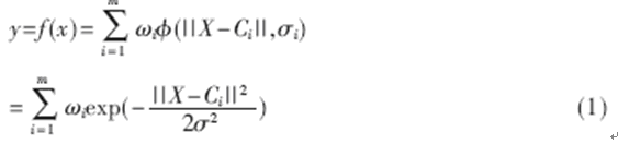上式中,m是隱含層結(jié)點數(shù);||•||是歐幾里德范數(shù);X,Ci∈Rn, ωi是第i個基函數(shù)與輸出結(jié)點的連接權(quán)值(i=1,2,...,m)。