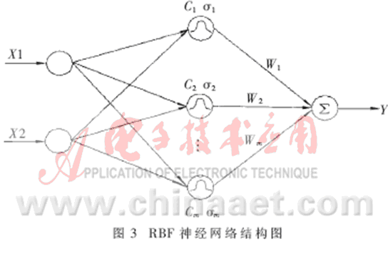 RBF神經(jīng)網(wǎng)絡(luò)即徑向基函數(shù)(Radial Basis Function)神經(jīng)網(wǎng)絡(luò)[3~4],其結(jié)構(gòu)如圖3所示。它很容易擴展到多輸出節(jié)點的情形,在此只考慮一個輸出變量Y的情況。RBFNN包括一個輸入層、一個隱含層和一個輸出層的最簡模式。隱含層由一組徑向基函數(shù)構(gòu)成,與每個隱含層節(jié)點相關(guān)的參數(shù)向量為Ci(即中心)和σi(即寬度)。徑向基函數(shù)有多種形式,一般取高斯函數(shù)[5]。具體如下: