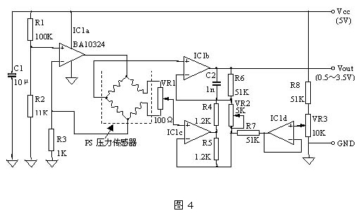 圖4是PS壓力傳感器的外圍電路設(shè)計(jì)實(shí)例,圖中用恒流源來驅(qū)動壓力傳感器。