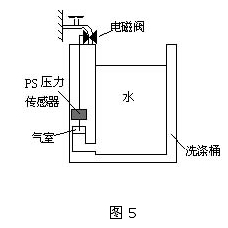 圖5是PS壓力傳感器在全自動洗衣機(jī)中的應(yīng)用實(shí)例。如圖所示,利用氣室,將在不同水位情況下水壓的變化,作為空氣壓力的變化檢測出來,從而可以在設(shè)定的水位上自動停止向洗衣機(jī)注水。