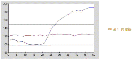 從圖1和圖2中可以看出,兩條黑線之間的數(shù)據(jù)很難斷定是哪個(gè)動(dòng)作產(chǎn)生的,因?yàn)閮蓚€(gè)動(dòng)作都可能產(chǎn)生這樣的值。所以,利用黑線之外的數(shù)據(jù)來判定是向右還是向左搖。因?yàn)閷?duì)于這兩個(gè)動(dòng)作,黑線之外的數(shù)據(jù)有明顯的差異,數(shù)據(jù)相差很多。對(duì)于圖1這些數(shù)據(jù)大于150,圖2中這些數(shù)據(jù)小于90。因此這些數(shù)據(jù)至少相差60,可以很容易地將向左、向右的兩個(gè)動(dòng)作區(qū)分開。