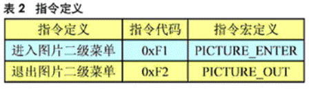 系統(tǒng)還定義了單片機(jī)與演示終端交互的指令,用于系統(tǒng)在主菜單和二級(jí)菜單之間的界面切換,指令從演示系統(tǒng)通過SCI傳給單片機(jī),單片機(jī)接收到之后進(jìn)入或退出二級(jí)菜單,見表2。
