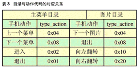 仿真器的外觀和操作類似一部移動(dòng)電話,但是并不代表某個(gè)特定的設(shè)備,而是提供對(duì)其所支持的API 的正確實(shí)現(xiàn),每個(gè)命令按鈕對(duì)應(yīng)著相應(yīng)的API函數(shù)。從圖6中可以看到手機(jī)的導(dǎo)航鍵,我們更改了導(dǎo)航鍵的API函數(shù),使其從鼠標(biāo)單擊觸發(fā)的方式轉(zhuǎn)換為串口動(dòng)作代碼控制。首先,我們編寫了J2ME的串口接收程序,用于接收從單片機(jī)傳來的單字節(jié)的type_action值;然后將type_action以參數(shù)的形式傳給API,手機(jī)根據(jù)不同的type_action值執(zhí)行不同的動(dòng)作,包括菜單上下翻、進(jìn)出二級(jí)子菜單、圖片翻轉(zhuǎn)等。手機(jī)動(dòng)作與type_action的對(duì)應(yīng)關(guān)系如表3。