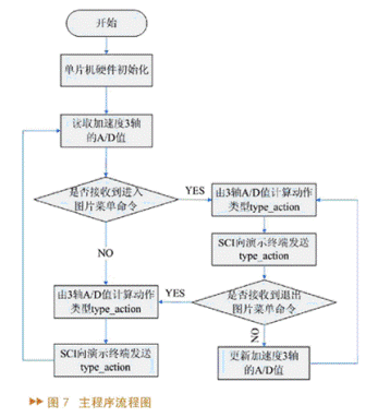 系統(tǒng)上電后,首先要對(duì)單片機(jī)的硬件系統(tǒng)進(jìn)行初始化、配置寄存器等操作,之后才可以進(jìn)行數(shù)據(jù)采集,將加速度的值進(jìn)行A/D轉(zhuǎn)換,得到量化的值。圖片菜單是二級(jí)菜單,如果沒有接到演示系統(tǒng)傳給單片機(jī)進(jìn)入二級(jí)菜單的指令,則單片機(jī)一直在主程序運(yùn)行,不斷地采集A/D值、進(jìn)行動(dòng)作判定,并向演示系統(tǒng)發(fā)送type_action的指令。演示系統(tǒng)可根據(jù)接收到的type_action的類型采取相應(yīng)的動(dòng)作。如果單片機(jī)接收到進(jìn)入二級(jí)菜單的命令,則進(jìn)入圖片菜單,同時(shí)也執(zhí)行類似于主程序的動(dòng)作判定程序,并不斷更新A/D采樣值,發(fā)送type_action,直到接收到退出二級(jí)菜單指令才退出。下面詳細(xì)介紹一下各個(gè)功能模塊的具體設(shè)置。