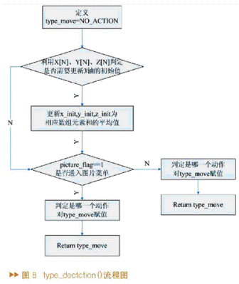 動(dòng)作檢測(cè)主要是用獲得的三組數(shù)據(jù)值x_data[N]、y_data[N]、z_data[N]來判定當(dāng)前動(dòng)作是系統(tǒng)設(shè)定動(dòng)作中的哪一個(gè),如果符合,則發(fā)送這個(gè)動(dòng)作對(duì)應(yīng)的預(yù)定義值給演示終端,否則發(fā)送NO_ACTION。type_dectction()用來實(shí)現(xiàn)動(dòng)作檢測(cè),其中type_move為函數(shù)內(nèi)部變量,用于記錄動(dòng)作代碼。type_dectction()進(jìn)行動(dòng)作檢測(cè)的流程如圖8所示。