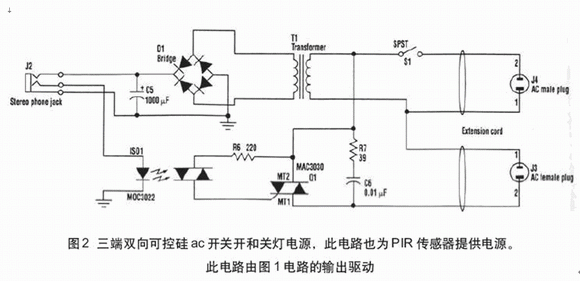圖2示出三端雙向可控硅控制的ac開關(guān),此電路也為PIR供電提供非穩(wěn)壓12~14Vdc。通過匹配的電話插口由來自圖1電路的輸出脈沖驅(qū)動三端雙向可控硅開關(guān)。用標準立體聲音頻纜線連接兩個電路。