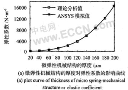 分別用理論方法和ANSYS數(shù)值模擬方法得出了在b=200μm時(shí)彈性系數(shù)k隨微結(jié)構(gòu)厚度h的變化情況,以及在h=50 μm時(shí)彈性系數(shù)k隨彈性臂寬度b的變化情況,分別如圖3(a),(b)所示。圖3(a)中,2種計(jì)算方法求出的彈性系數(shù)的平均相對(duì)誤差為0.86%,圖3(b)中平均相對(duì)誤差為1.06%??梢?種方法計(jì)算出來的結(jié)果基本吻合。從上述分析可知,在彈簧臂總長確定的情況下,彈簧的彈性系數(shù)取決于微結(jié)構(gòu)的厚度h和彈性臂的寬度b,而且,和6的關(guān)系近似于線性,因此,可以根據(jù)動(dòng)力學(xué)系統(tǒng)的具體要求和加工的工藝性能來選擇合理的h和b,從而滿足傳感器整體性能的要求。