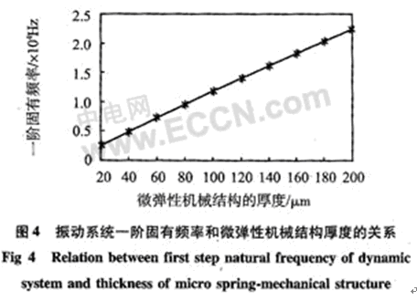 振動(dòng)系統(tǒng)的固有頻率公式為 ,m為微結(jié)構(gòu)的當(dāng)量質(zhì)量,這里面含有每個(gè)彈性臂簡化到A點(diǎn)的等效質(zhì)量,鑒于等效質(zhì)量求出來誤差較大,僅用有限元模擬工具ANSYS對(duì)振動(dòng)系統(tǒng)進(jìn)行模態(tài)分析。模擬中,取硅的密度為ρ=2330 kg/m3,l3=l4=2000μm參數(shù)含義如圖2所示,其余取上述給定的數(shù)值,則振動(dòng)系統(tǒng)的一階固有頻率為22.37 kHz,在垂直于微結(jié)構(gòu)平面的方向上振動(dòng)。同時(shí),模擬出了彈性臂寬度b=200μm時(shí),一階固有頻率f和微結(jié)構(gòu)厚度h的關(guān)系圖如圖4所示??梢娬駝?dòng)系統(tǒng)的一階固有頻率和微結(jié)構(gòu)的厚度h近似地保持線性的關(guān)系。