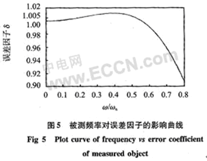 式中a′和a分別為加速度的測得值和真實(shí)值。δ和阻尼比ζ與被測物體的頻率ω有關(guān),當(dāng)ζ=0.65~0.07時(shí),ζ最接近1,因此,取ζ=0.65進(jìn)行計(jì)算機(jī)模擬,結(jié)果如圖5所示??梢钥闯觯罕粶y頻率比較小的時(shí)候測得的加速度值更接近于真實(shí)值,當(dāng)ω/ωn=0.2時(shí),ζ=1.0054,因此,傳感器在設(shè)定的頻率范圍1~4.5 kHz的誤差不大于0.54%。