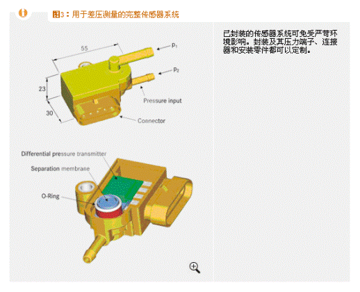 如果將壓力變送器用作獨(dú)立測量系統(tǒng),必須保護(hù)其免受外部環(huán)境影響,如在其結(jié)合處附件的灰塵和水霧。這一點(diǎn)是通過使用在大多數(shù)應(yīng)用中都具有良好的媒介抵抗性和充分的溫度穩(wěn)定性的塑料封裝實(shí)現(xiàn)的。該封裝及其壓力端子、連接器和安裝零件都適合客戶定制(圖3)。對(duì)于要求極高的應(yīng)用,還可以提供不銹鋼封裝版本。應(yīng)用包括測量差壓、監(jiān)測腐蝕性氣體濾波器和測量冷卻劑壓力。