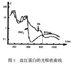 脈搏信號(hào)主要由動(dòng)脈血的充盈引起, 而血液中還原血紅蛋白( Hb) 和氧合血紅蛋白( HbO2 ) 含量變化將造成透光率的變化, 當(dāng)氧合血紅蛋白和還原血紅蛋白對(duì)光的吸收量相等時(shí), 透射光的強(qiáng)度將主要由動(dòng)脈血管的收縮和舒張引起, 此時(shí)能夠比較準(zhǔn)確地反映出脈搏信號(hào)。圖5 為血紅蛋白的光吸收曲線, 從圖中可以看出, 血液中HbO2 和Hb 對(duì)于不同波長(zhǎng)光的吸收系數(shù)的差異明顯, 而且2 條曲線好幾個(gè)不同的交點(diǎn), 考慮到在805 nm 波長(zhǎng)處, 血紅蛋白的光吸收率比較低, 那么透射過(guò)手指的光強(qiáng)較大, 有利于光敏器件的接收, 因此發(fā)射光源的波長(zhǎng)選擇為805 nm。