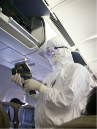 2009年4月29日晨5點(diǎn)58分,甲型H1N1流感擴(kuò)散以來首架抵達(dá)中國的墨西哥航班AM098航班降落于浦東機(jī)場。旅客下機(jī)之前,檢驗(yàn)檢疫人員身穿防護(hù)服,手持德圖精密型紅外測溫儀testo845,登機(jī)對所有乘客進(jìn)行體溫檢測。