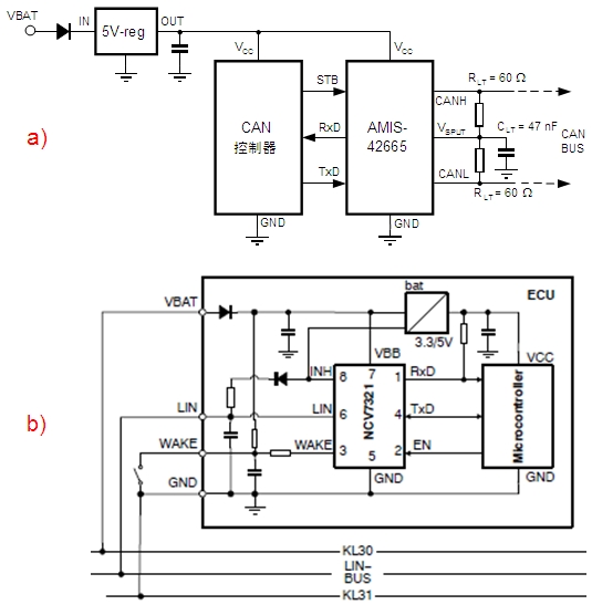 圖3:基于安森美半導(dǎo)體收發(fā)器的典型CAN電路(圖a)及LIN電路(圖b)。