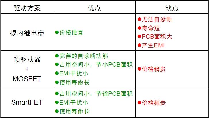 表2:板外大功率負(fù)載驅(qū)動(dòng)方案優(yōu)缺點(diǎn)比較