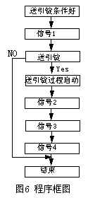 根據(jù)光檢測電裝置的工作過程,只要現(xiàn)場測定送引錠過程中各個光電信號發(fā)生的時間,結(jié)合送引錠過程與光電信號的關(guān)系,利用PLC應(yīng)用程序中的相關(guān)數(shù)據(jù),編制符合要求的PLC程序,將PLC程序輸出信號輸入至PLC的輸入模塊,替代原光電信號的輸入信號。其程序框圖如圖6所示。
