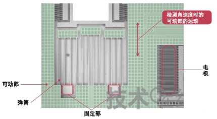 新傳感器由MEMS中常見(jiàn)的固定部、可動(dòng)部、連接固定部與可動(dòng)部的彈簧,以及檢測(cè)可動(dòng)部運(yùn)動(dòng)的電極構(gòu)成。利用電極靜電容量隨著可動(dòng)部的運(yùn)動(dòng)而發(fā)生變化的特性來(lái)檢測(cè)角速度和加速度(圖2)。檢測(cè)角速度的電極只有在彎道等使車(chē)輛轉(zhuǎn)向時(shí)才檢測(cè)信號(hào)。