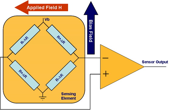 當(dāng)在一個(gè)很薄的鐵條上施加磁力線方向與經(jīng)過鐵條的電流方向垂直的磁場(chǎng)時(shí),鐵條內(nèi)的電阻就會(huì)發(fā)生變化。這種傳感器通常采用單臂電橋形式,如圖所示,電橋由靜態(tài)阻值相同的磁阻構(gòu)成。在測(cè)量過程中,電橋上施加電壓Vb,使電流通過電阻。只要磁場(chǎng)H存在,在兩組四個(gè)相反放置的電阻器中,第一組兩個(gè)電阻的磁化矢量轉(zhuǎn)向電流,使電阻值變大;而另兩個(gè)電阻的磁化矢量背離電流,使電阻值變小。在線性范圍內(nèi),傳感器輸出與所施加的磁場(chǎng)強(qiáng)度成正比。