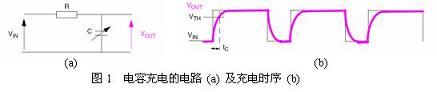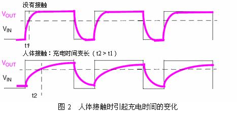 如圖1(a)所示,在RC網(wǎng)絡(luò)施加周期性充電電壓Vin,測(cè)量Vout會(huì)得到如(b)的時(shí)序,通過(guò)檢測(cè)充電開(kāi)始到Vout到達(dá)某一門(mén)限值的時(shí)間tc的變化,就可以判斷出是否有人體接觸。圖2顯示出有人體接觸時(shí)充電時(shí)間會(huì)變長(zhǎng)。